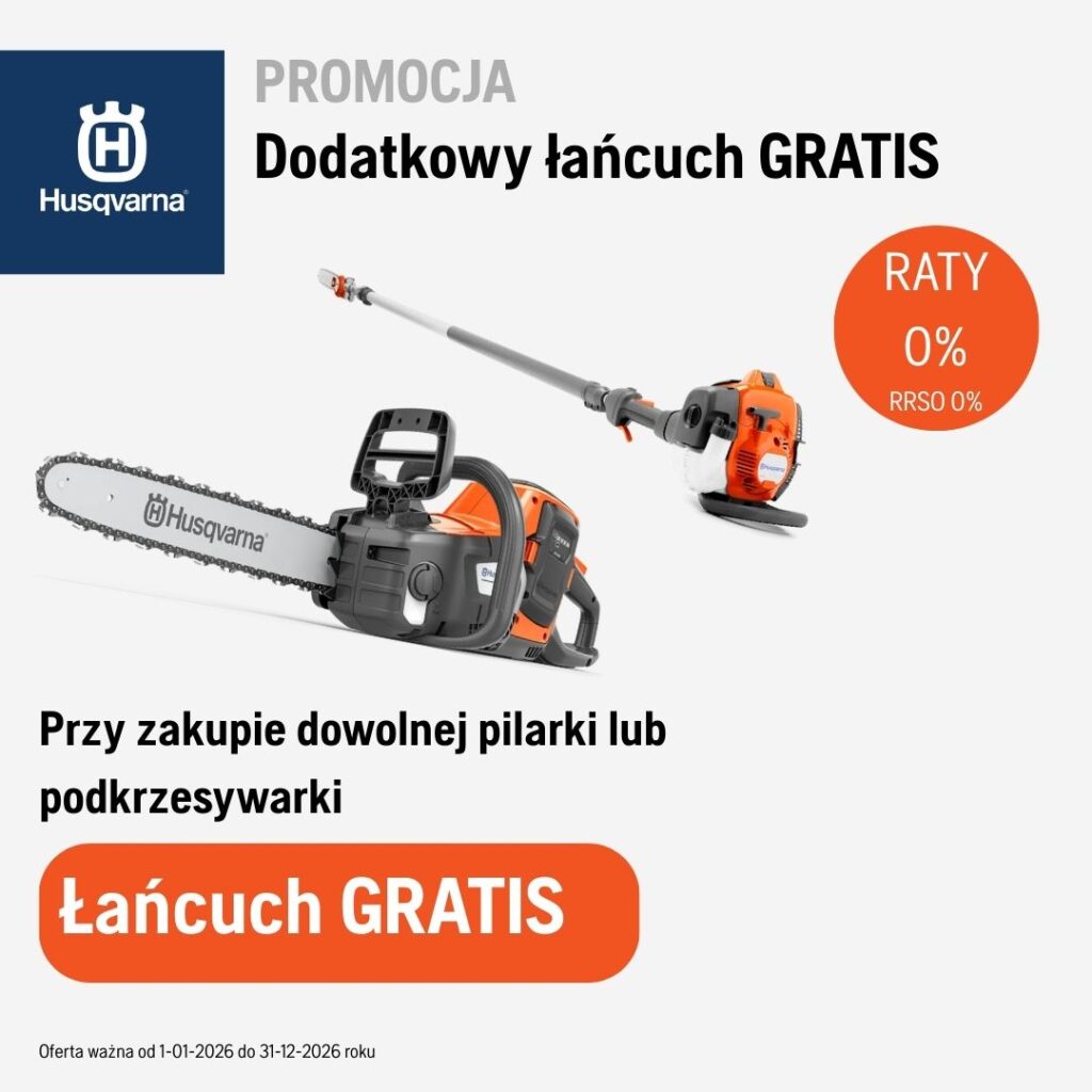 Teraz, przy zakupie  dowolnej pilarki lub podkrzesywarki dodatkowy łańcuch otrzymasz GRATIS. Oferta ważna do 31.12.2026 roku lub wyczerpania zapasów.