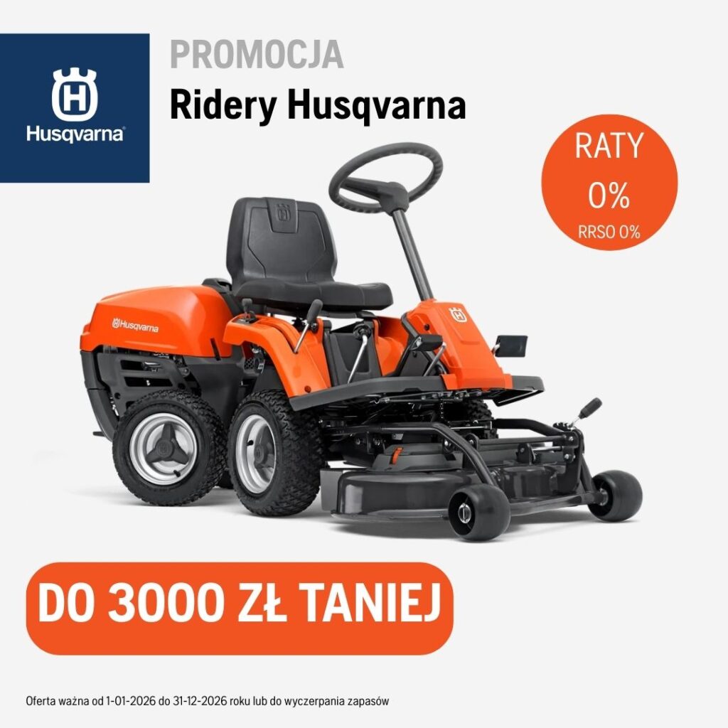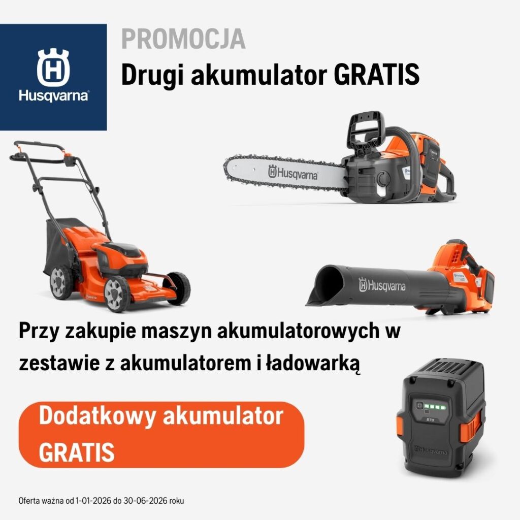 Tylko teraz, przy zakupie wybranych riderów Husqvarna, dodatkowa maszyna akumulatorowa gratis. Oferta ważna do 31.12.2026 roku lub wyczerpania zapasów.